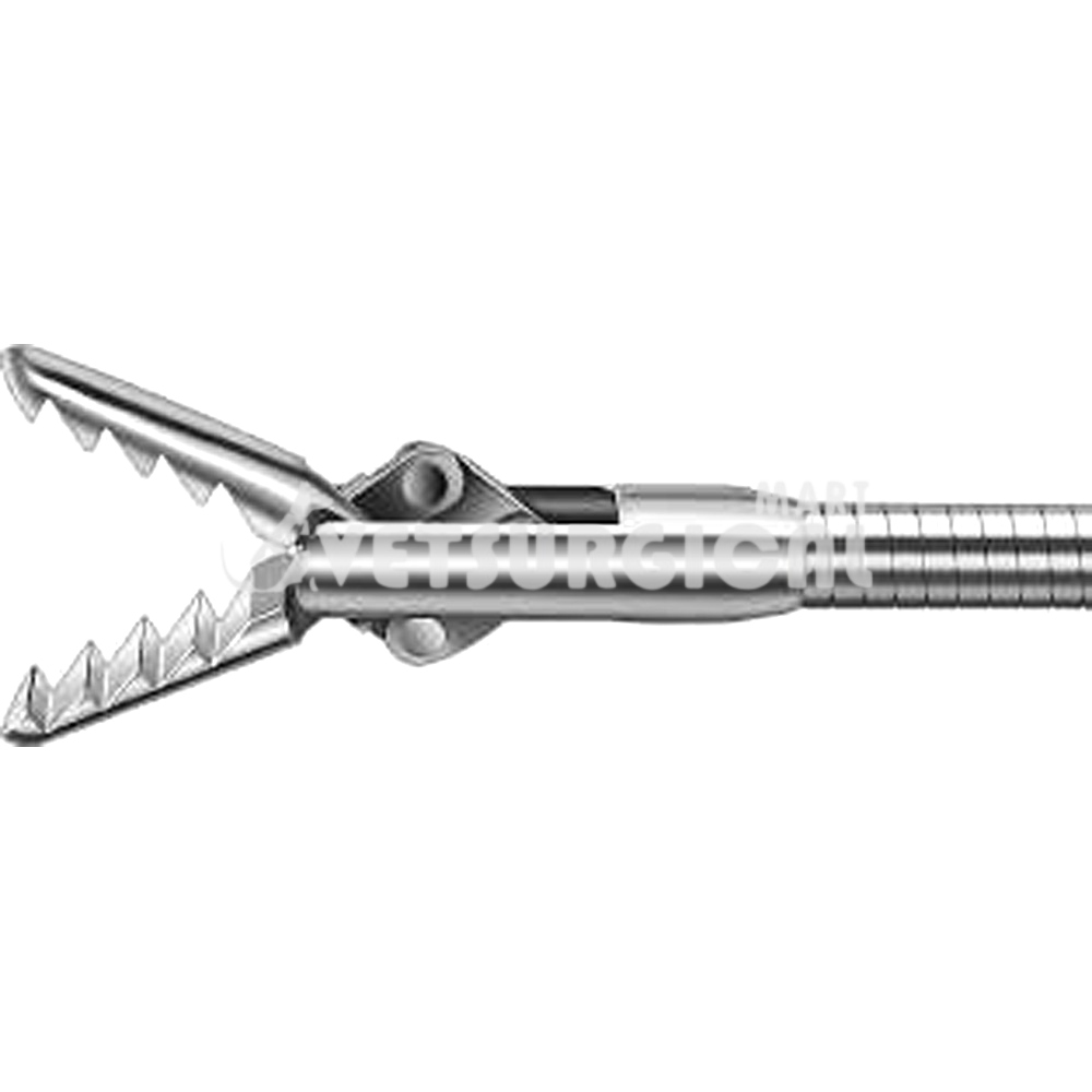Precise alligator jaws allow controlled tissue and foreign body handling